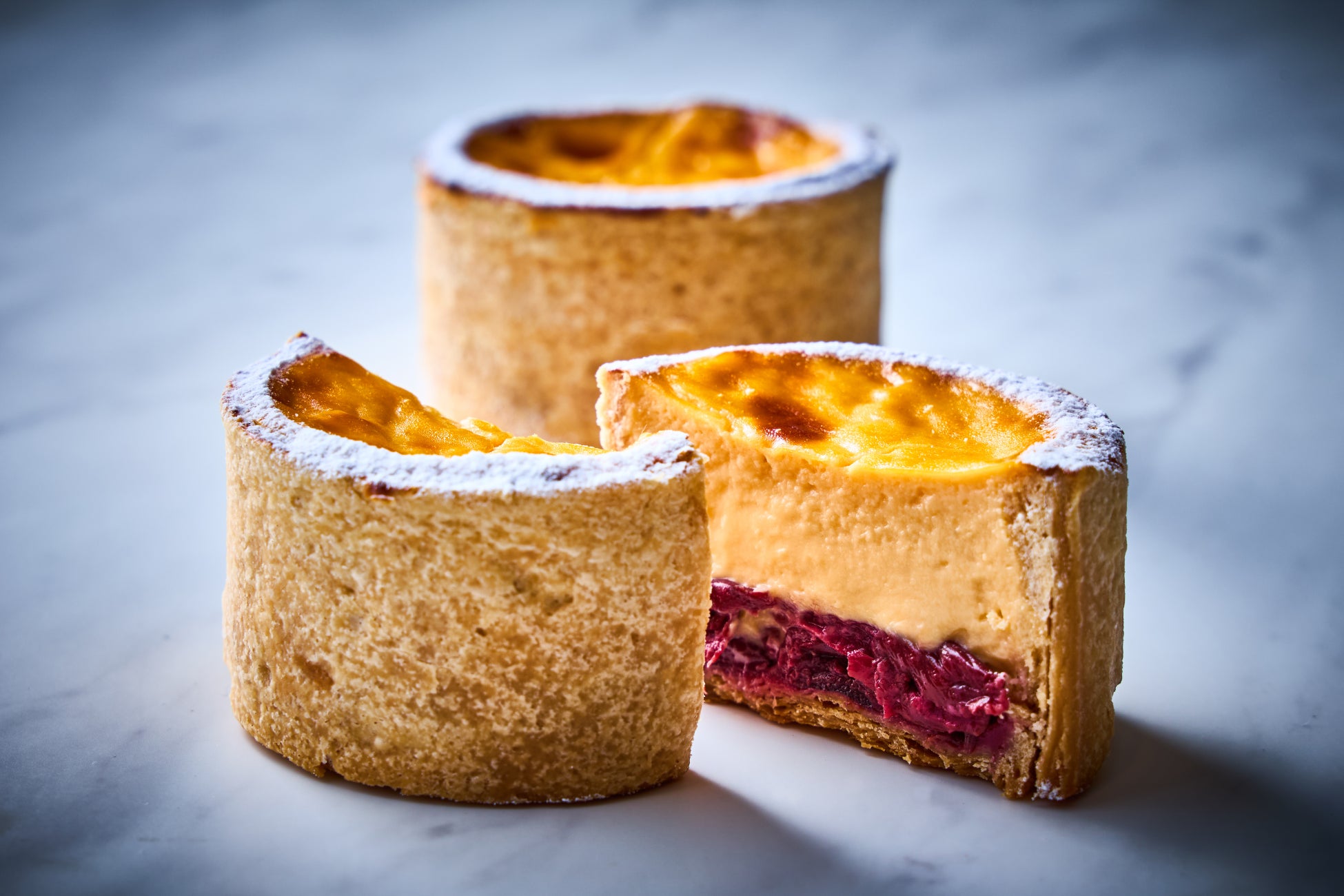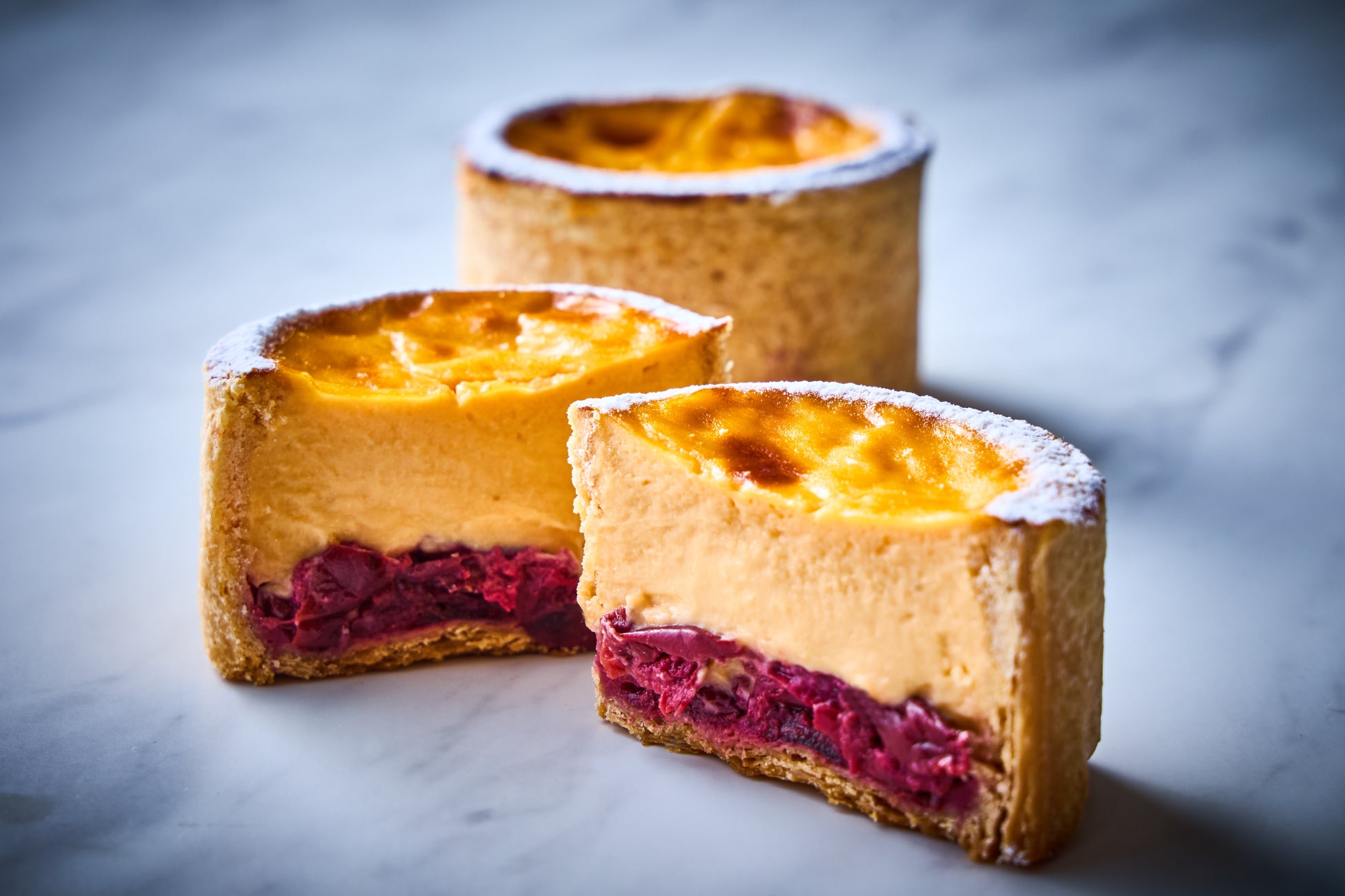 発酵バターを練り込んだパイ生地に、ジャージー牛乳・奥久慈卵・マダガスカル産バニラビーンズを使用したクリーミーで甘いキルシュ風味のカスタードクリームとサワーチェリーのコンポートを閉じ込めて焼き上げた季節のフランです。