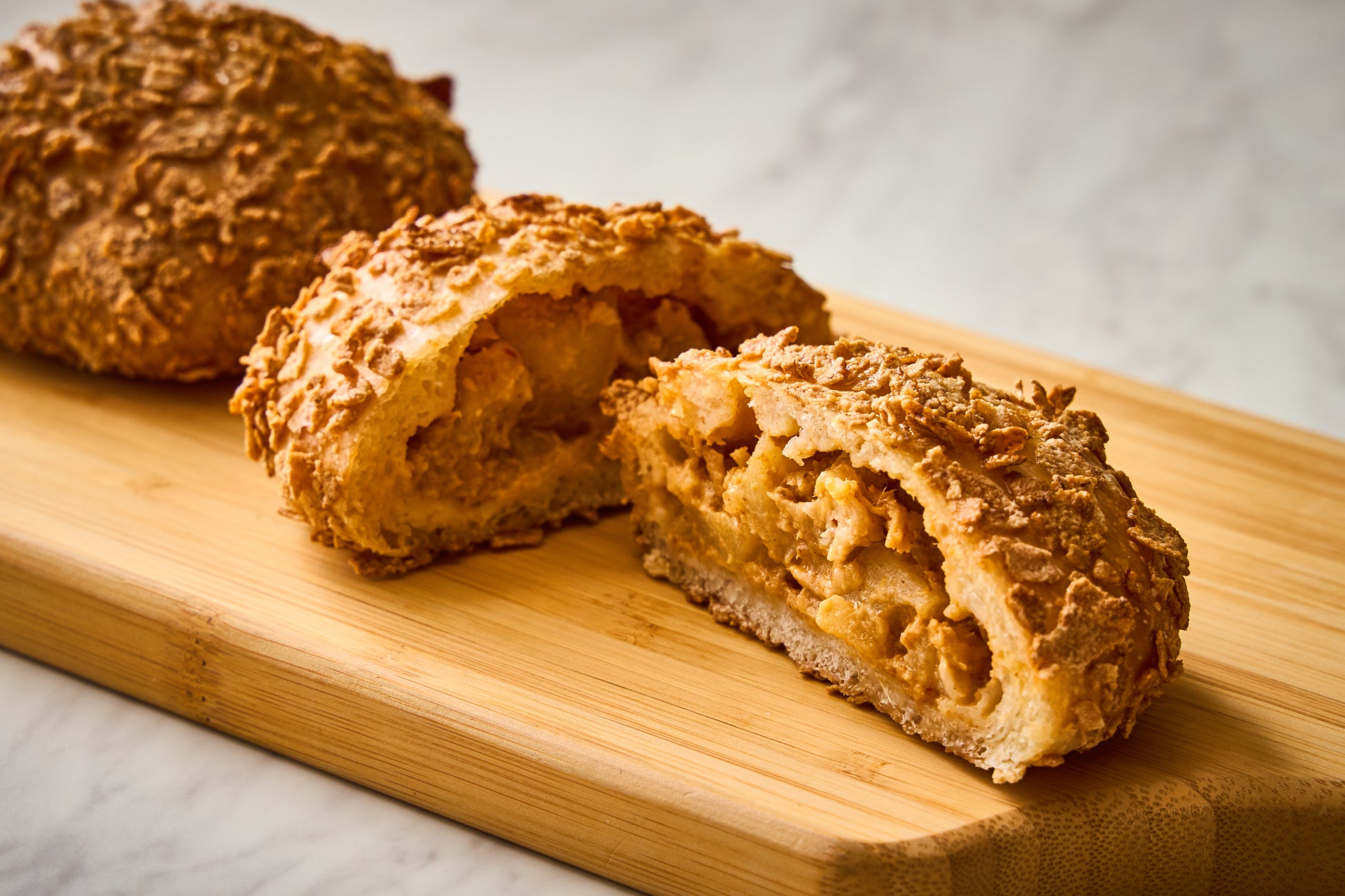 タイ発祥のココナッツミルクを使用した、独特な味わいが魅力の「マッサマンカレー」を包み、香ばしく焼き上げたカレーパンです。生地には食べ応えのある玄米フレークを使用し、カリカリとした食感が楽しめます。ココナッツミルクのまろやかな甘さとスパイスの調和が絶妙で、カレーの奥深い風味が口いっぱいに広がります。食事やおやつにもおすすめです。