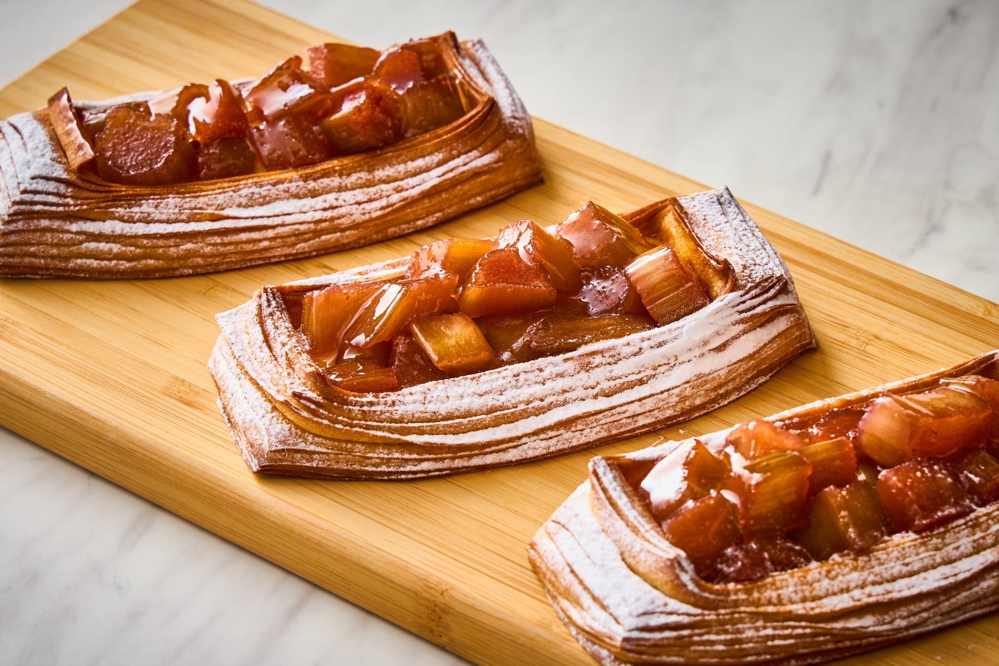 定期的に味を変えてご提供しているデニッシュの新作は、クリームチーズを入れたカスタードクリームを絞り、初夏に食べごろを迎える野菜“ルバーブ”のシロップ漬けを乗せて焼き上げました。シャキシャキの食感と、酸味と甘みのバランスが絶妙な逸品です。