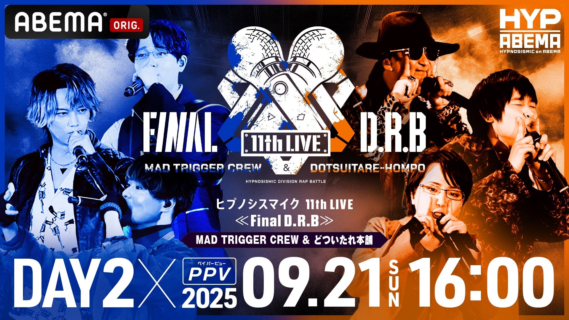 このたび「ABEMA PPV」での独占生放送が決定した、『ヒプノシスマイク -Division Rap Battle- 11th LIVE≪Final D.R.B≫』では、ラップバトルの勝敗が観客のリアルタイム投票によって決まる、“日本初”の観客参加型「インタラクティブ映画」として大きな話題を呼んだ、映画『ヒプノシスマイク –Division Rap Battle-』で繰り広げられたファイナルディビジョン・ラップバトル〝First Stage〟の対戦カードとなるディビジョン組み合わせにて開催。9月6日(土)・7日(日)に京王アリーナ TOKYO(武蔵野の森総合スポーツプラザ)にて「Fling Posse& 麻天狼」公演、9月20日(土)・21日(日)に日本工学院アリーナにて「MAD TRIGGER CREW & どついたれ本舗」公演、そして、10月4日(土)・5日(日)に日本工学院アリーナにて「Buster Bros!!! & Bad Ass Temple」公演がそれぞれ開催されます。