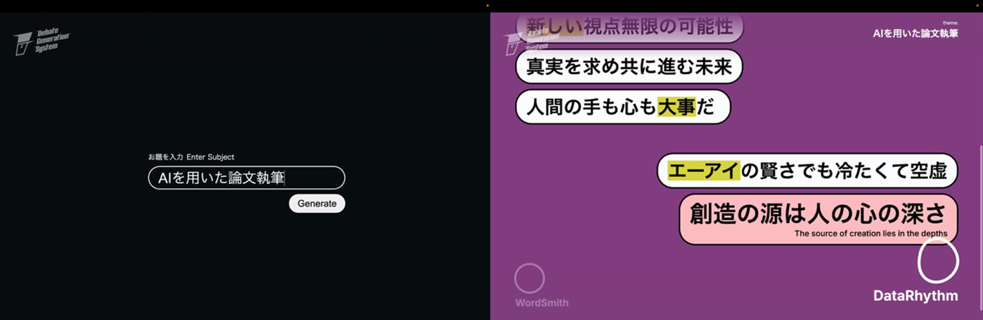 朝日新聞社は主に、様々な議論をエンターテイメントとして昇華させるための、生成AIを活用したディベートシステムのコンセプト設計、また兵庫県立大学の三林亮太氏と共に、与えられたテーマを元に日本語ならではのラップ独特のライム(韻)を考慮したリリックの自動生成を担当しました。生成されたリリックは音声合成され、ビート(音楽)とともにオーディオ・ビジュアルパフォーマンスとして統合しました。