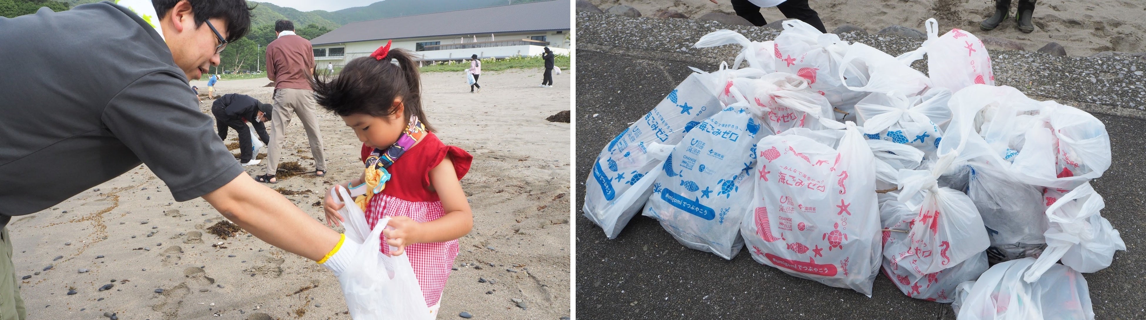そんな美しい砂浜と海の自然を守ろうと、海開きを前に行われた清掃活動には、地域の人たちや観光施設の関係者ら約80人が参加しました。参加者は強い海風が吹くなか、砂浜をくまなく回り、浜に散らばっていた流木やペットボトルのかけら、ビニール袋、化学繊維と見られる漁業用の網の切れ端などを拾い集めました。