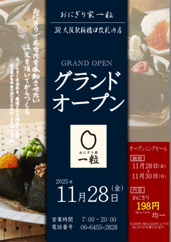 【(株)ジェイアール西日本デイリーサービスネット】11月28日(金)、JR大阪駅 桜橋口改札内に「おにぎり家一粒」をオープンします!