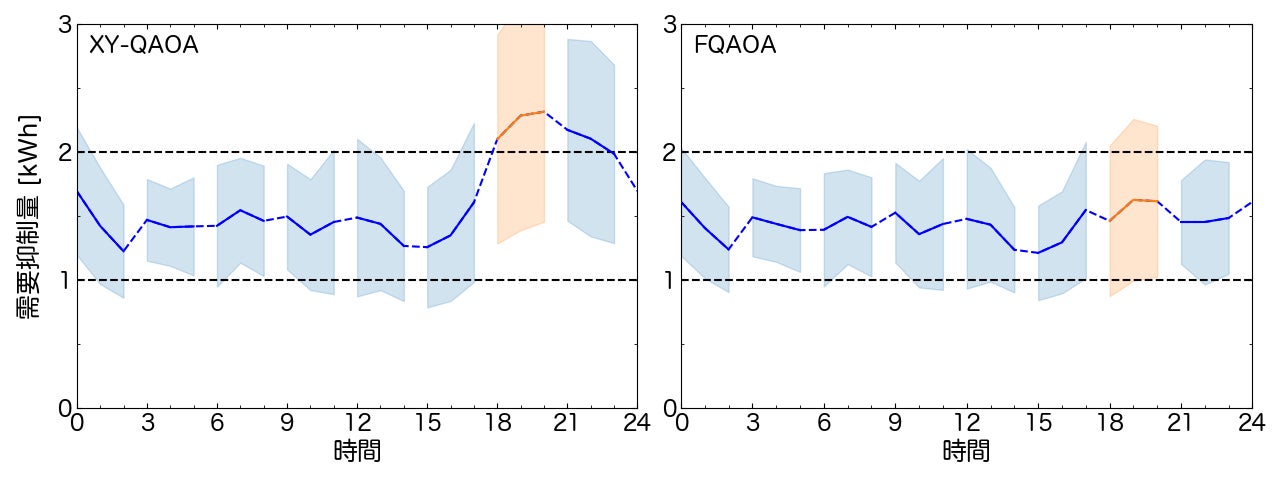 所望の調達電力を全時間帯で1 kWh~2 kWhとした場合の計算結果(近似レベル10における出力)において、18:00から21:00の時間帯では従来手法では電力の獲得量が2.23±0.858 kWhだったのに対し、「FQAOA」を用いた場合は1.57±0.604 kWhという、より精度の高い電力調達が可能になった(図2の強調表示)。これにより、期待される調達量と実際の需要抑制量との乖離を抑えることができ、安定的な電力調達に貢献することが期待される。