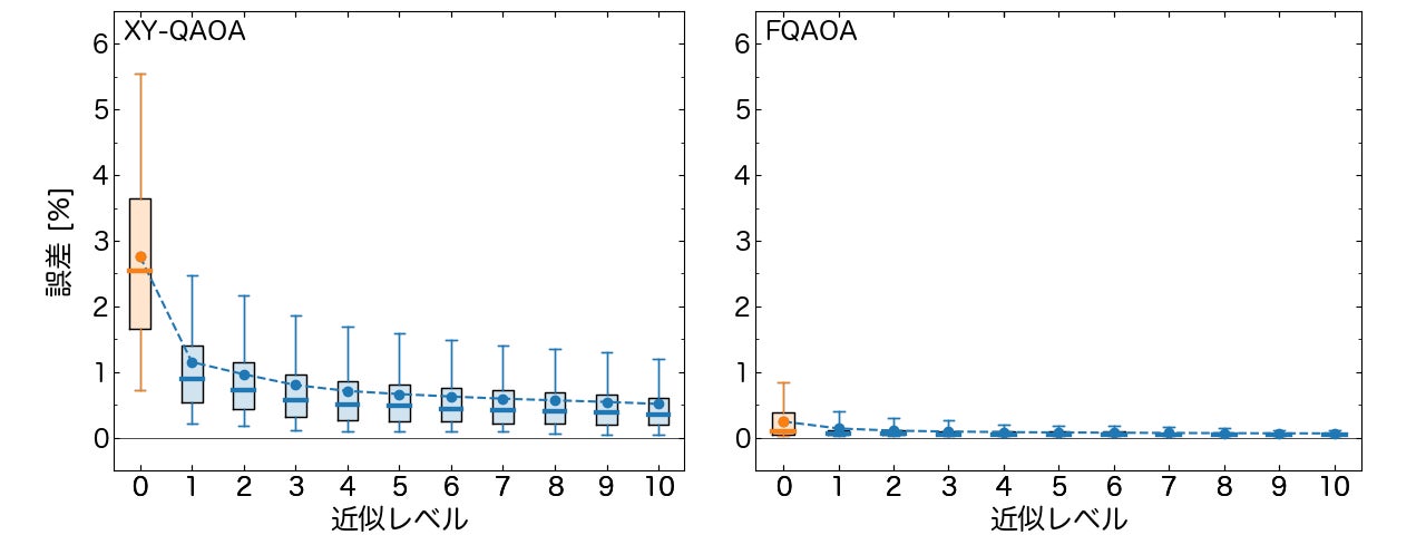 従来手法では、特に近似レベルが0の場合に最適解との誤差が27.6%に達していたが、「FQAOA」を導入することによって、その誤差は2.5%にまで改善された(図1の強調表示)。