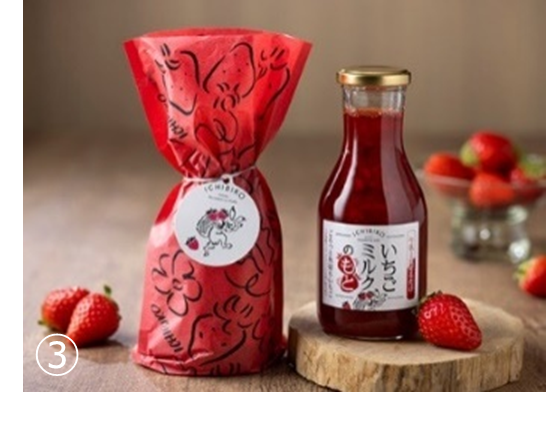①真っ⾚でつやつや、ジューシーで⽢酸っぱい⾹りと味が濃厚な農場直送の完熟ミガキイチゴを堪能できる、人気No.1のショートケーキ。甘さ控えめの生クリームときめ細やかなくちどけの良いスポンジ生地が、主役のいちごの甘酸っぱさを引き立てます。②ごろっと丸ごといちごと、カットいちごを練りこんだいちご色の生クリームを重ね、ふわふわ生地で包んだ特製生いちごロール。濃厚ながらもあっさりと食べられます。③人気メニュー「いちびこミルク」がおうちで味わえる、濃縮タイプのいちごミルクのもとを瓶詰にしました。