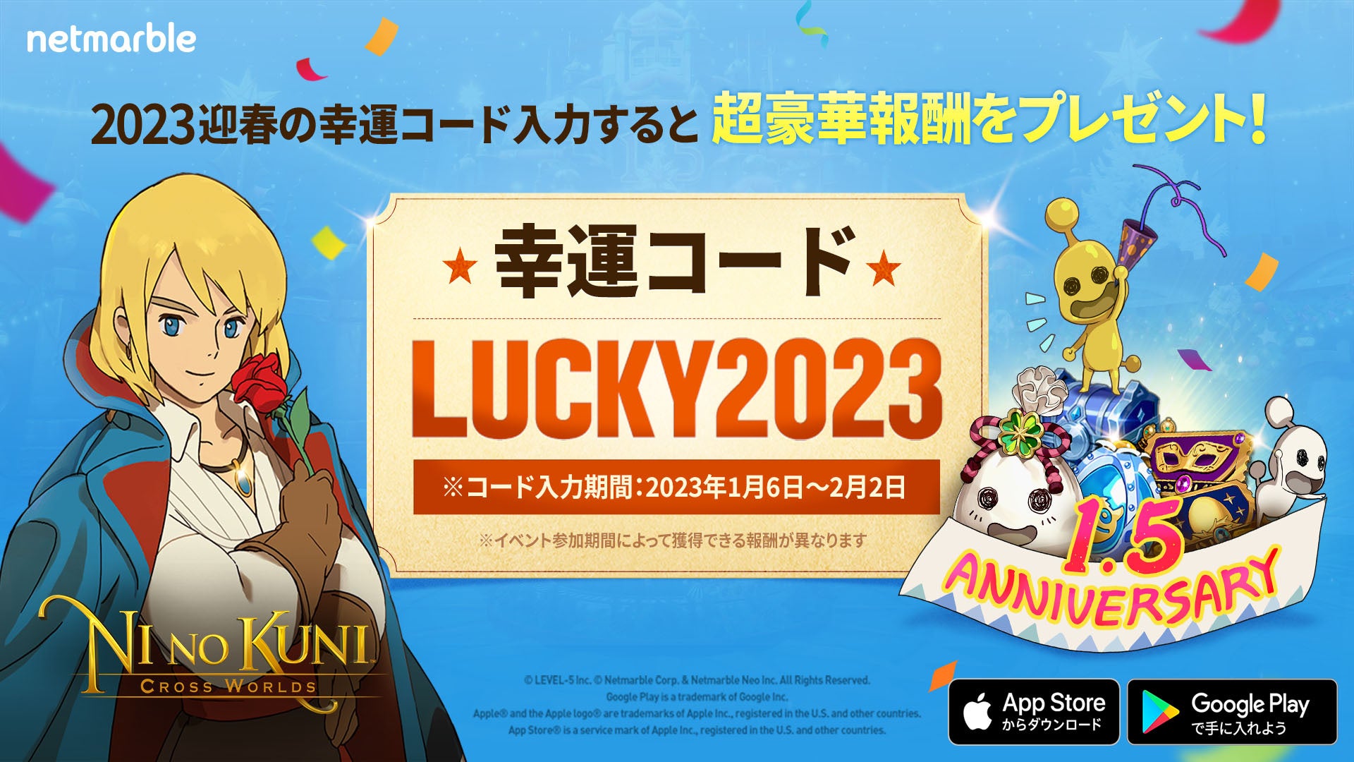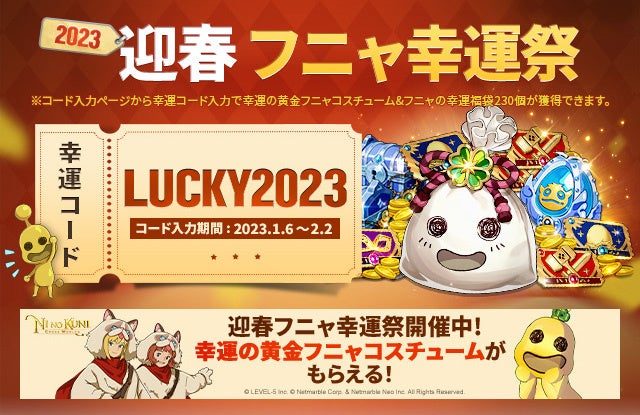 ネットマーブルは、レベルファイブとタッグを組みサービスを提供しているファンタジーアートRPG『二ノ国:Cross Worlds』(略称:ニノクロ)において、本日1月6日(金)より、Twitterなどの各種メディアを通じて「黄金のフニャコスチューム」などの豪華特典を獲得できるイベント「2023迎春フニャ幸運祭」(以下、フニャ幸運祭)を開始いたしました。また、本日のゲームアップデートにて、新システムや新コンテンツなどを多数実装したことも併せてお知らせいたします。