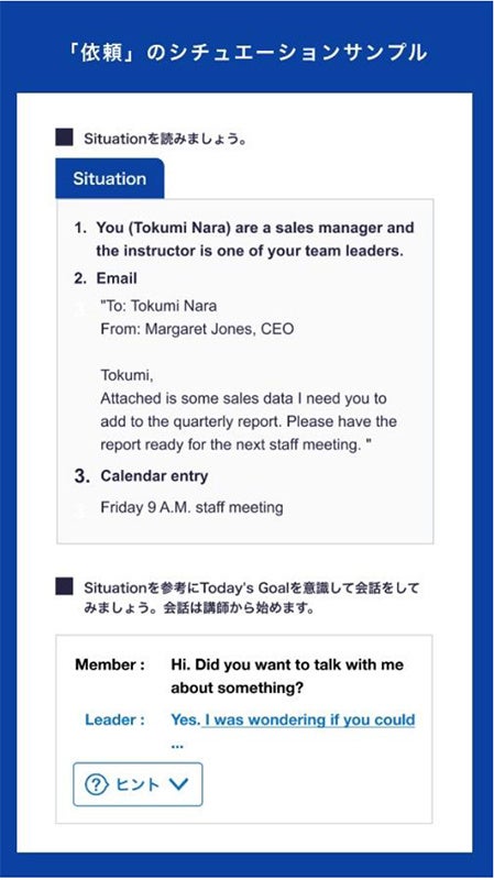 『スタディサプリENGLISH』には、英語のリスニングやスピーキングを強化する機能としてディクテーションやAIによる発話判定が可能なリード&ルックアップがありますが、より実践的なアウトプットの場としてのオンライン英会話を併せて提供している「英会話セットプラン」は、提供を開始して以来、「インプットとアウトプットの両方が手軽に学習でき、成長実感も得やすい」と利用者から好評いただいています。ビジネスシーンでさらに「話せるようになる」ことを目的として、社員に英語学習の機会を提供する法人への提供も行ってきました。コロナ禍を通じて活用の増えたオンラインミーティングなど、これまでとは異なるビジネスシチュエーションの広がりといった状況も受け、特定の状況下で実践的に英語を学べるよう新たに教材を追加することと致しました。