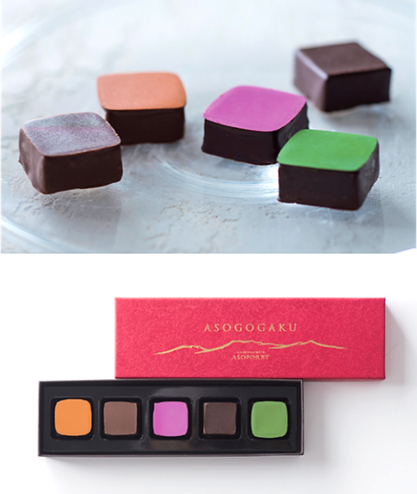 阿蘇五岳それぞれのイメージを美しいボンボンショコラに仕立てました。アーモンドや紅茶、フランボワーズなど、それぞれの山の特徴を表現しています。