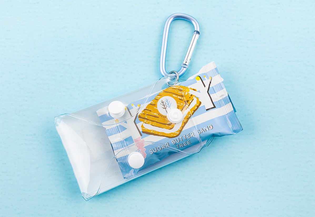 『シュガーバターサンドの木』が1個ぴったり入るかわいいクリアポーチが誕生。表は定番『シュガーバターサンドの木』の個装と同じデザインでまるで本物のよう!裏面はクリアになっているため中身が見えやすく使えるポーチとして大活躍の予感。小物も収納可能なオリジナルクリアポーチをプレゼントいたします。