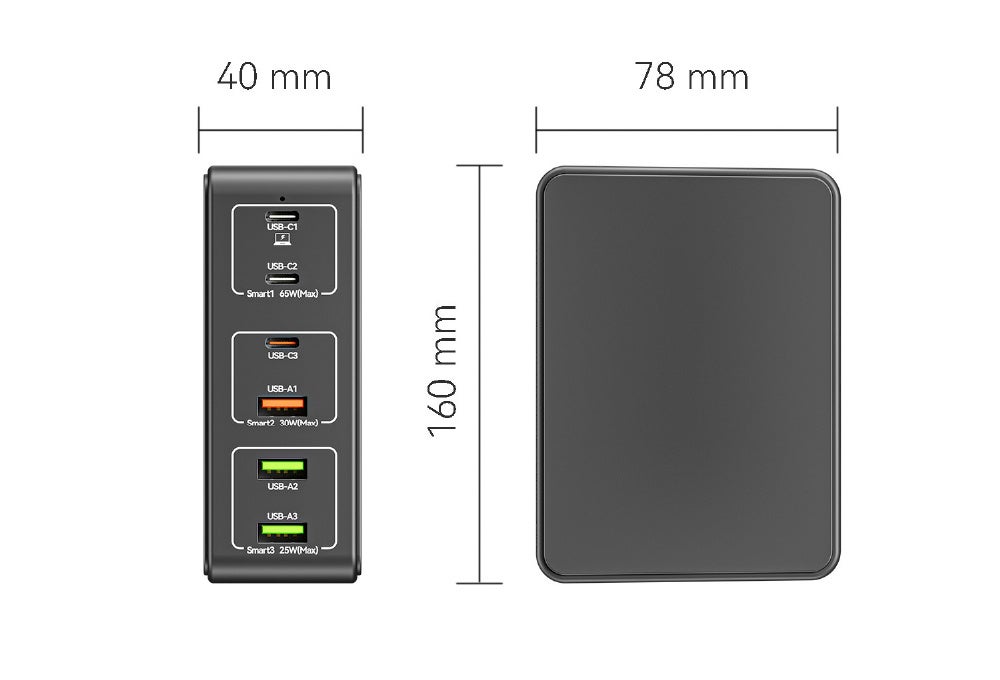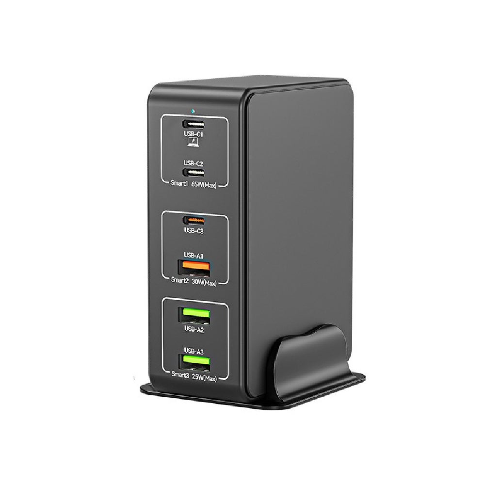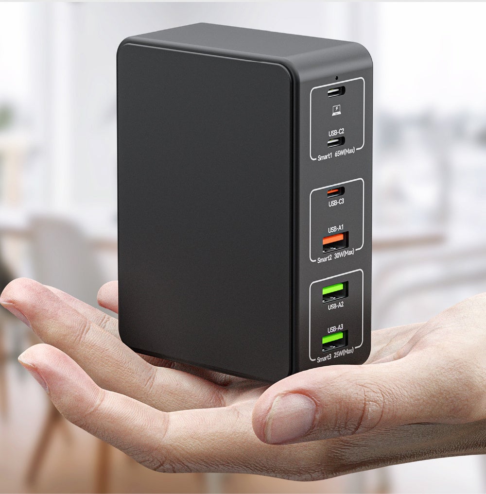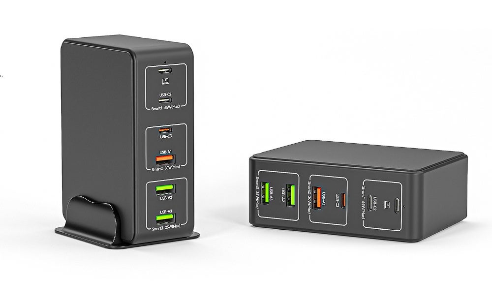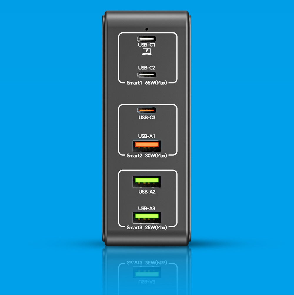 上からUSB-C最大65W接続ポート、中段は最大30WのUSB-CとUSB-A、下段は最大25WのUSB-Aの各ポートを搭載。
