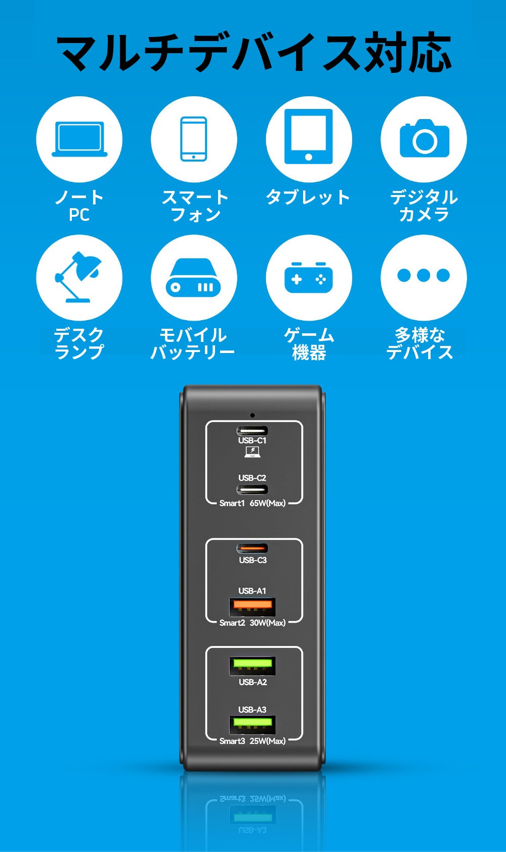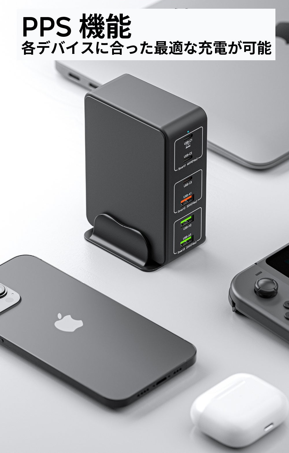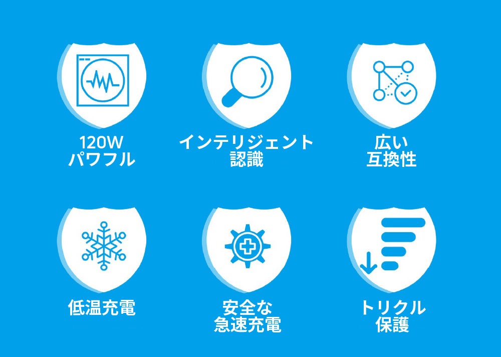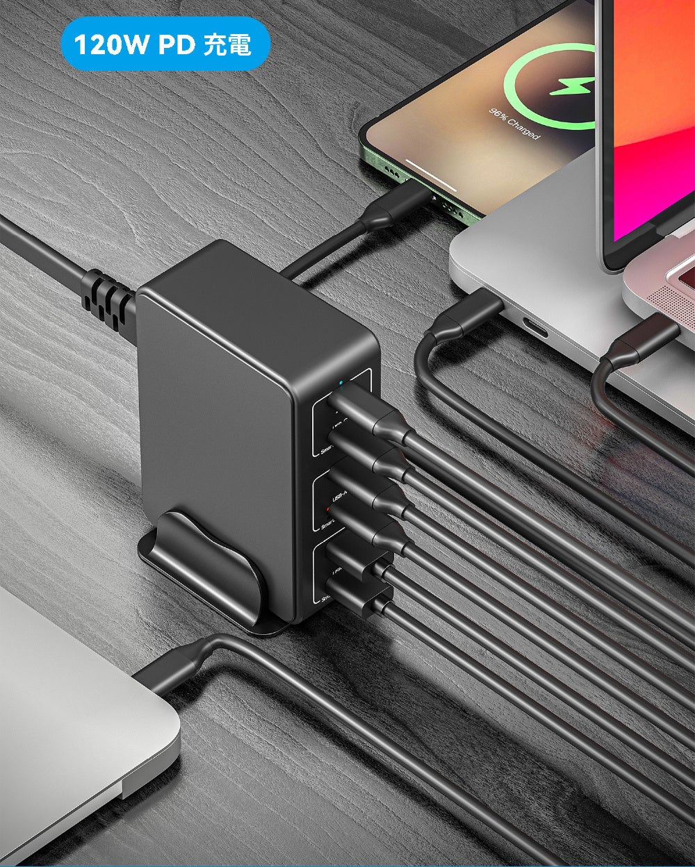 - 一台でパワフルな合計120W出力、マルチデバイス対応の充電器