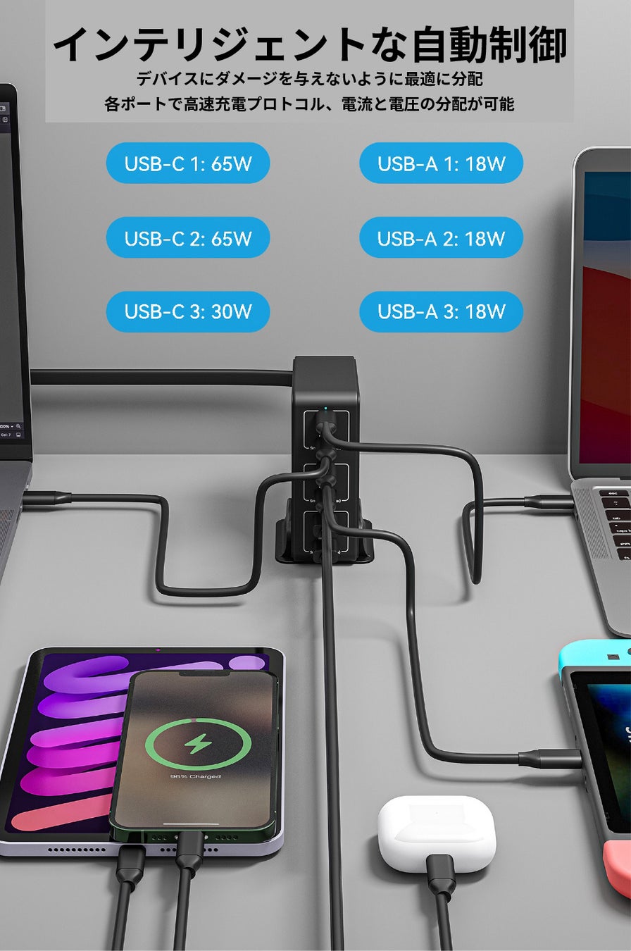 - 3×USB-C、3×USB-A、計6つの充電口で多様なデバイスに接続