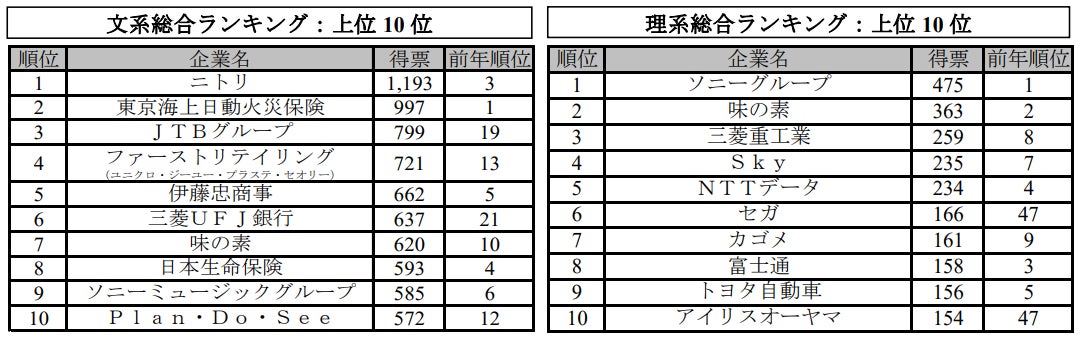文系はニトリが初の1位。理系はソニーグループが2年連続1位