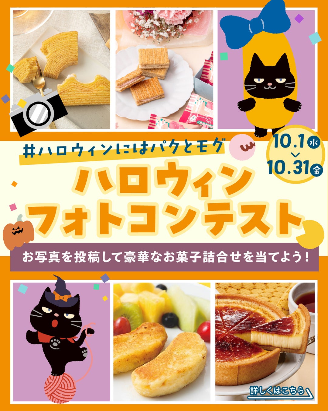 @paqtomogをメンション、「#ハロウィンにはパクとモグ」をつけてインスタグラムに投稿してくださいね♪投稿者の中から抽選で10名様に「パクとモグ」のお菓子5000円相当をプレゼント!