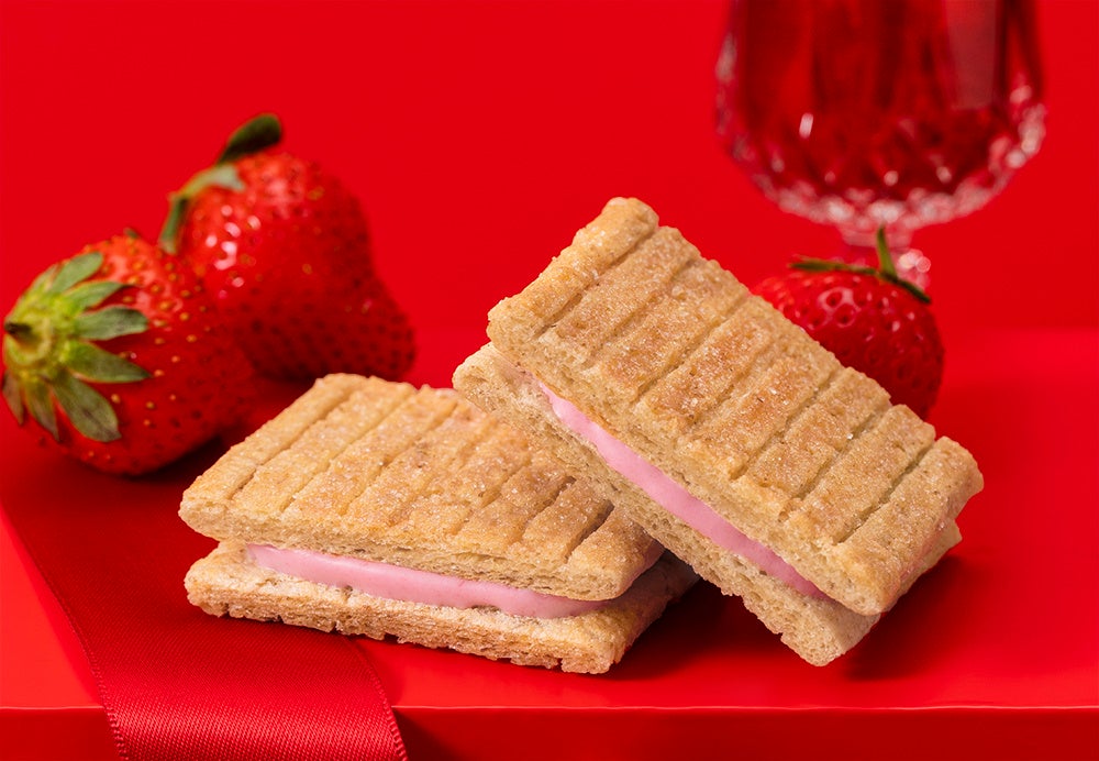 外から中まで、福岡が誇る「あまおう苺」づくし! あまおう苺果汁がとろけた「オリジナル苺バター」を生地にかけ、ジュワッと香り高く焼きあげました。あまおう苺100%のジューシー苺ショコラをサンドすれば、“あまおう苺バター味”の出来上がり!サクッとかむと、甘く瑞々しい苺の香りが口いっぱいに広がります。