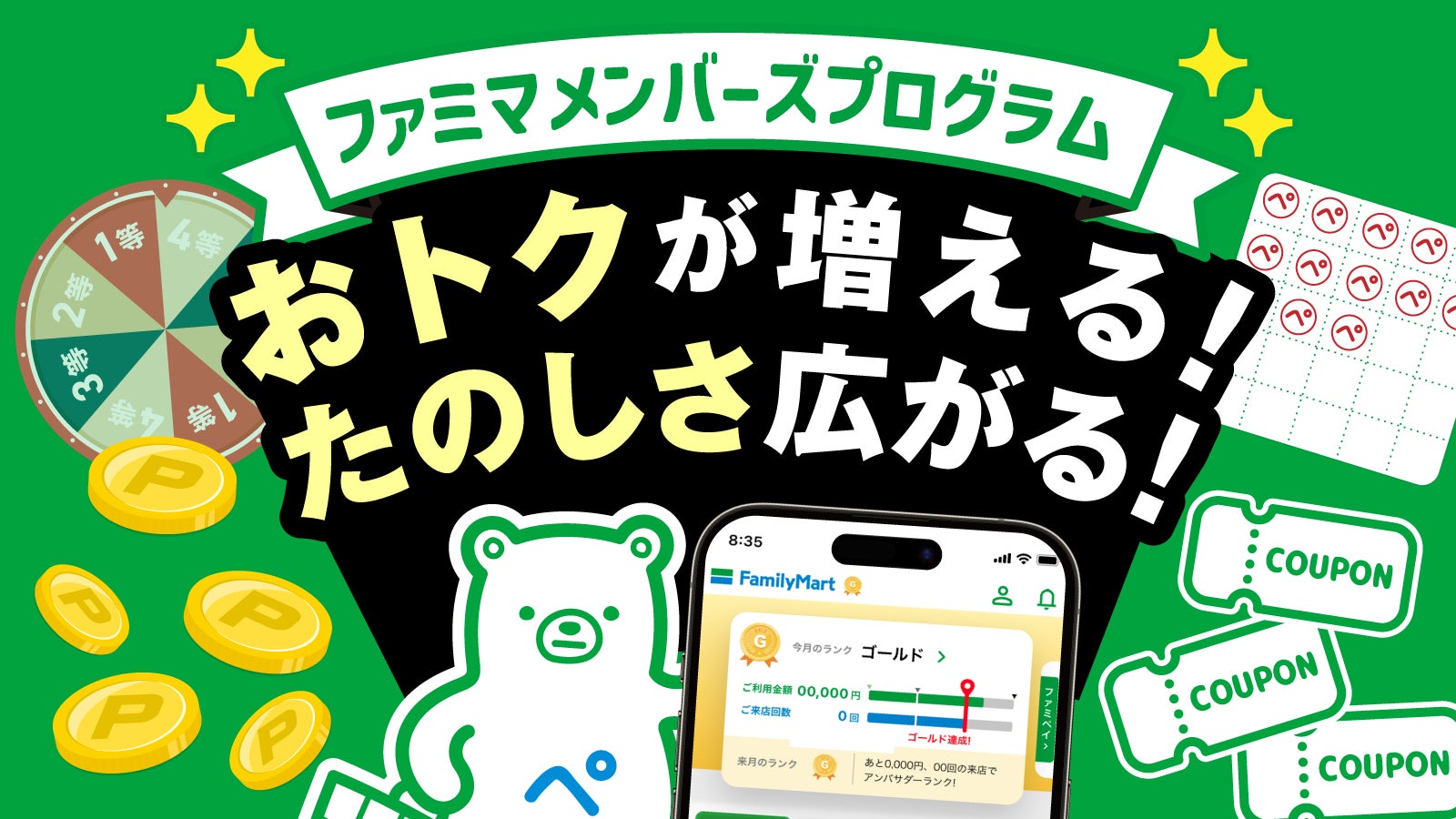 株式会社ファミリーマート(本社:東京都港区、代表取締役社長:細見研介)は、継続して取り組んでいる5つのキーワードの1つである「たのしいおトク」の一環として、ファミマのアプリ「ファミペイ」(以下:「ファミペイ」)の会員プログラム『ファミマ メンバーズプログラム』のサービスを2025年6月4日(水)から大幅拡充いたします。この拡充により、新たな「おトク」や、より会員さまのニーズに沿ったクーポンを提供できるようになりました。