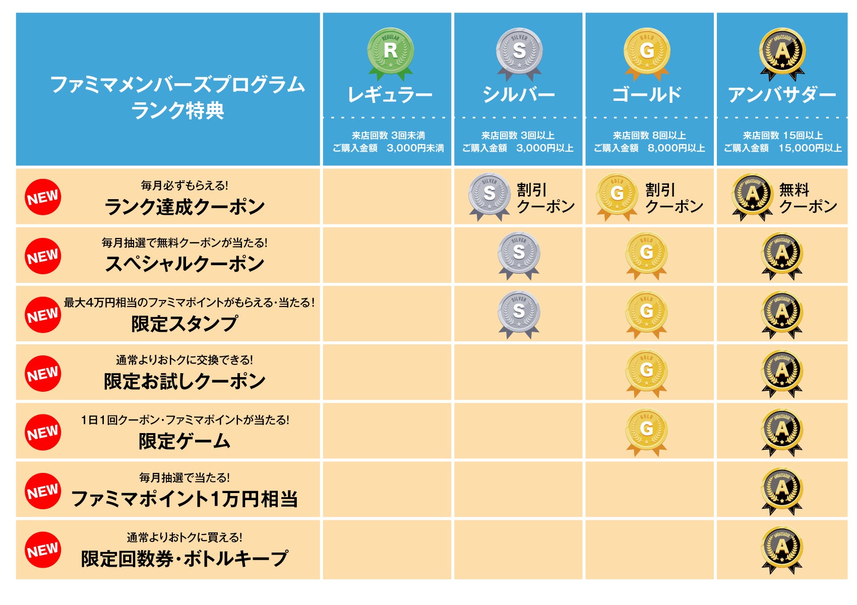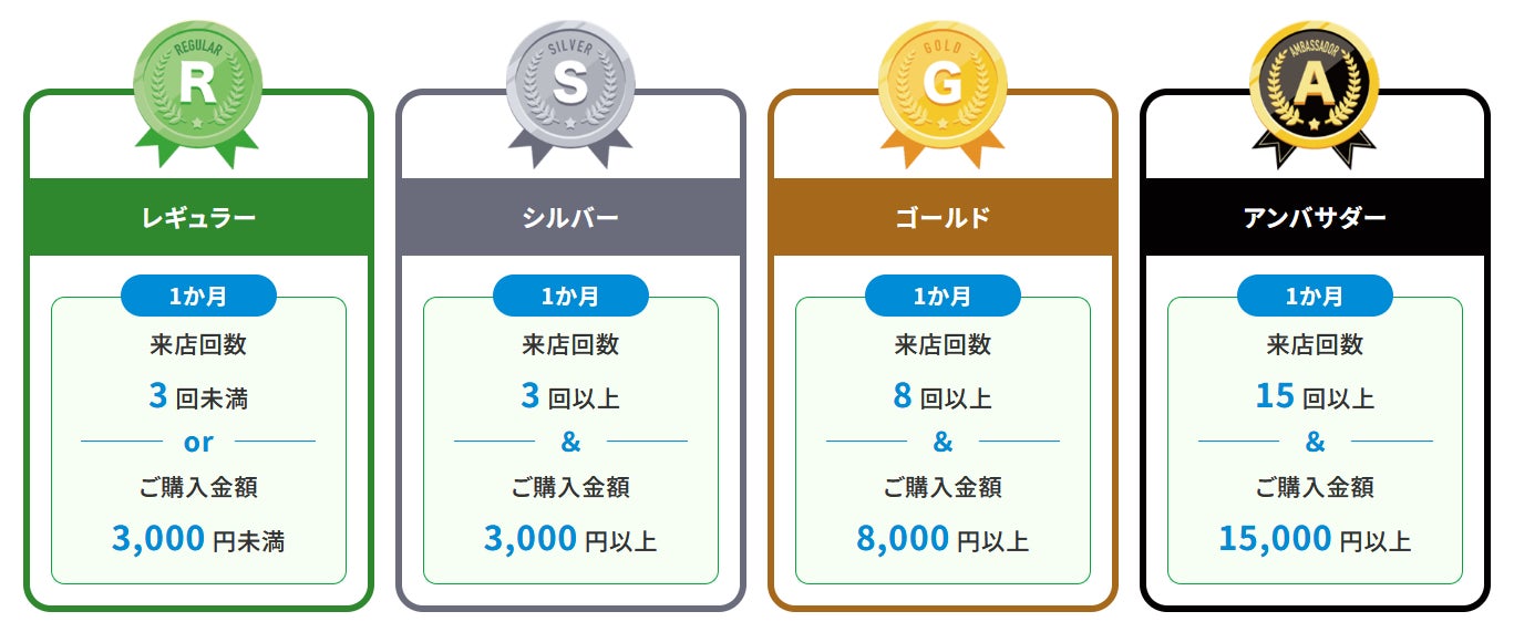 決済方法は問わず、提示するだけで来店回数、購入金額が加算されます。会員ランクは「アンバサダー」「ゴールド」「シルバー」「レギュラー」の4段階です。このたびのサービス拡充により、「シルバー」以上の方へ毎月必ず無料・割引クーポンがもらえる「ランク達成クーポン」(※1)を進呈いたします。