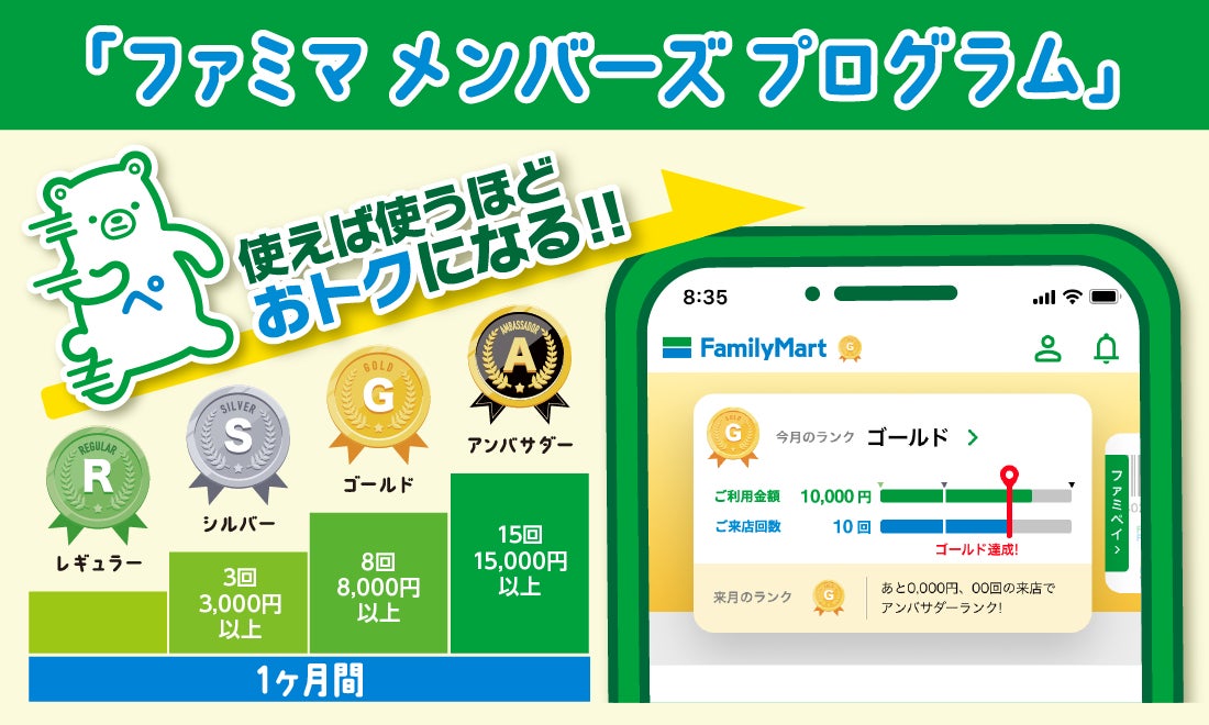 『ファミマメンバーズプログラム』は、ファミリーマートで「ファミペイ」を提示してお買い物をすると、月間の来店回数と購入金額に応じて翌月のランクが決定し、ランクに応じた特典が進呈される会員プログラムです。
