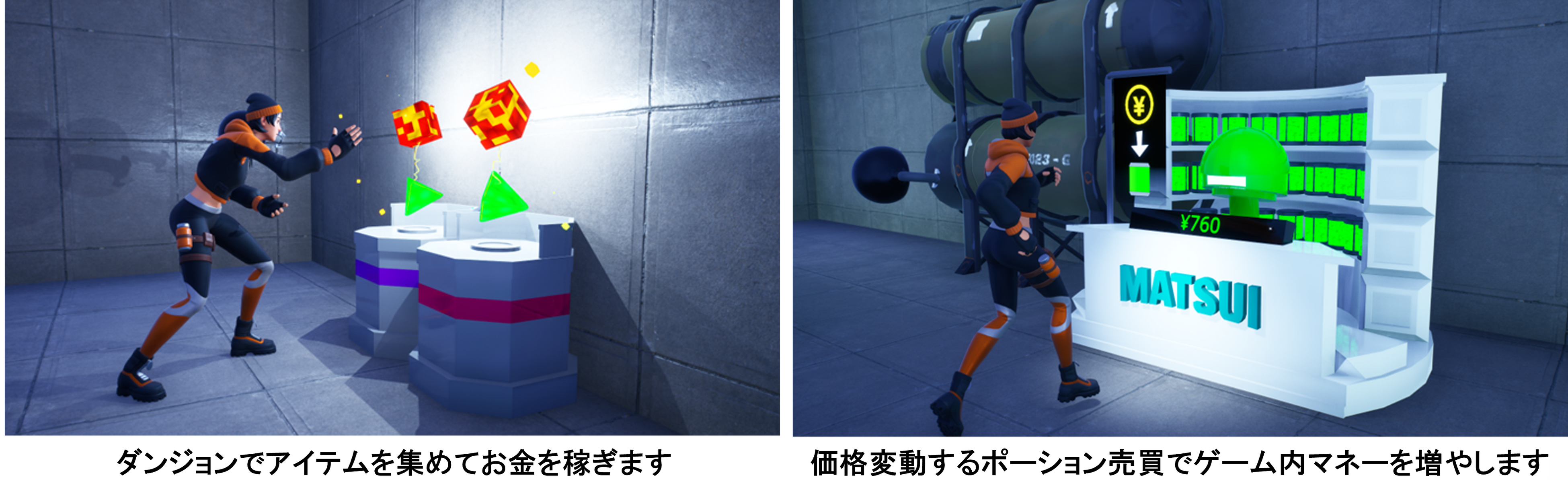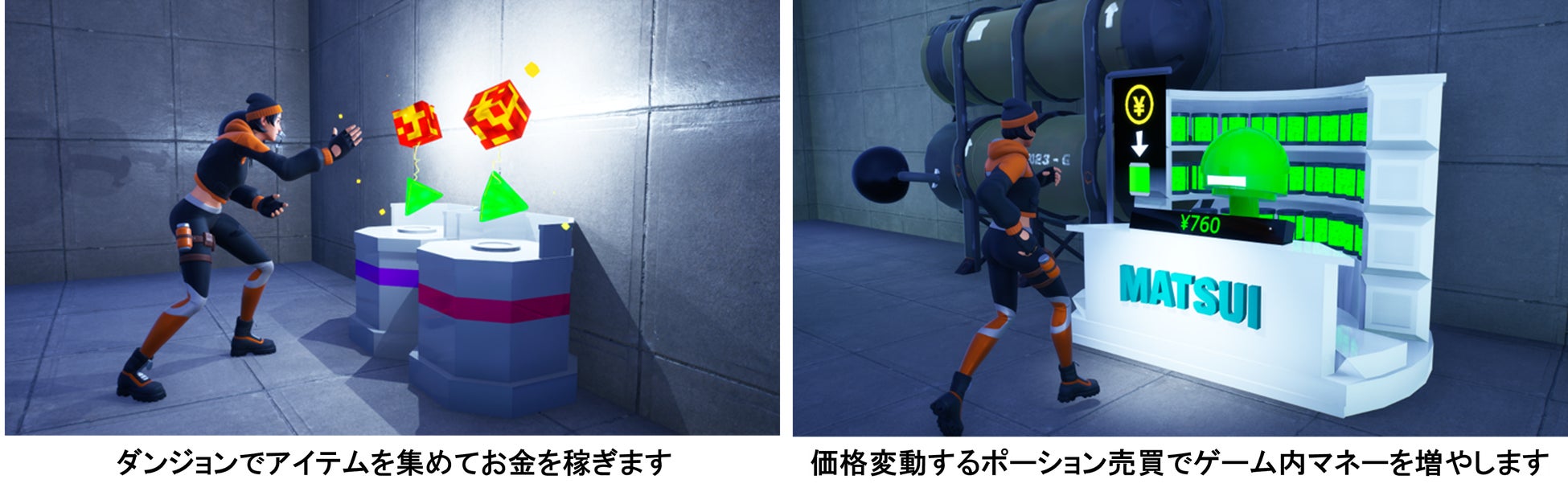 「MONEY TRADE FIGHT by 松井証券」は、収集したアイテムを元手に、価格が変動するポーションを売買してゲーム内マネーを戦略的に増やしていくゲームです。制限時間内にダンジョンを脱出し、最終的な獲得金額が多いプレイヤーが勝者となります。