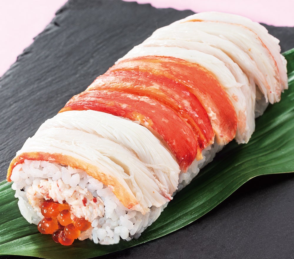 いくらとかにが入った太巻きを、かに棒肉でさらに巻いた人気の一品。