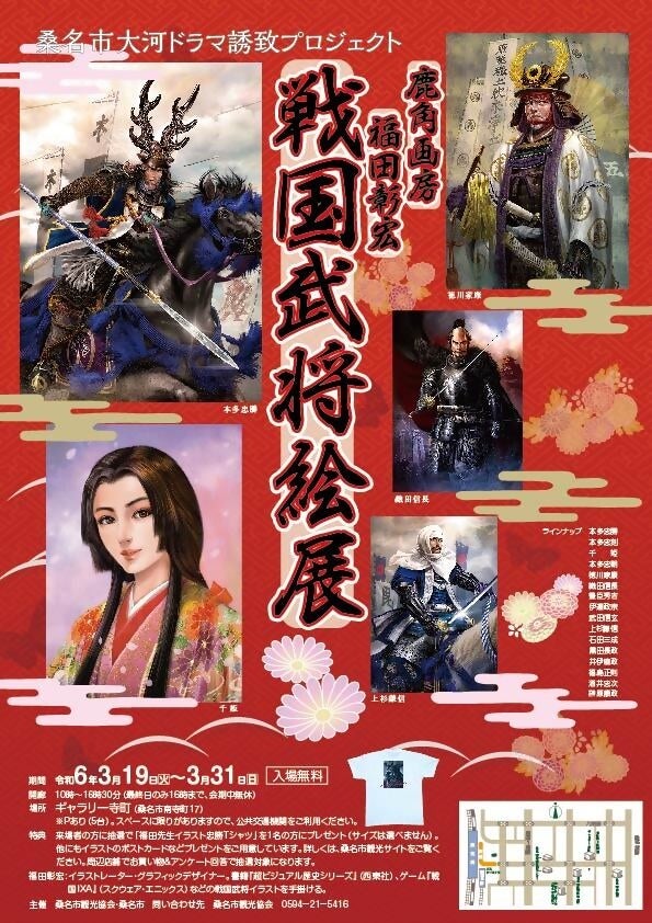 桑名市は、スクウェア・エニックスのオンラインゲーム 「戦国IXA 」や書籍「超ビジュアル! 日本の歴史人物大事典」(西東社)の戦国武将絵で話題の鹿角画房・福田彰宏氏による戦国武将絵展を令和6年3月19日(火)より市内のギャラリー寺町で開催する。桑名市では、本多忠勝と千姫の大河ドラマ誘致を目指しており、誘致に向けた機運醸成を図る。