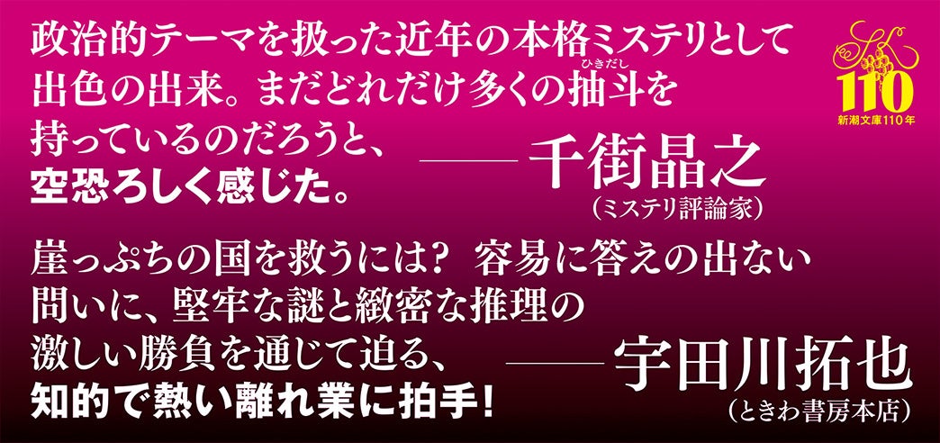 崖っぷちの国を救うには? 容易に答えの出ない問いに、堅牢な謎と緻密な推理の激しい勝負を通じて迫る、知的で熱い離れ業に拍手!