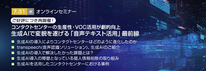 【トランスコスモスオンラインセミナー】【ご好評につき再開催!】コンタクトセンターの生産性・VOC活用が劇的向上 生成AIで変貌を遂げる「音声テキスト活用」最前線を7/31(水)に開催