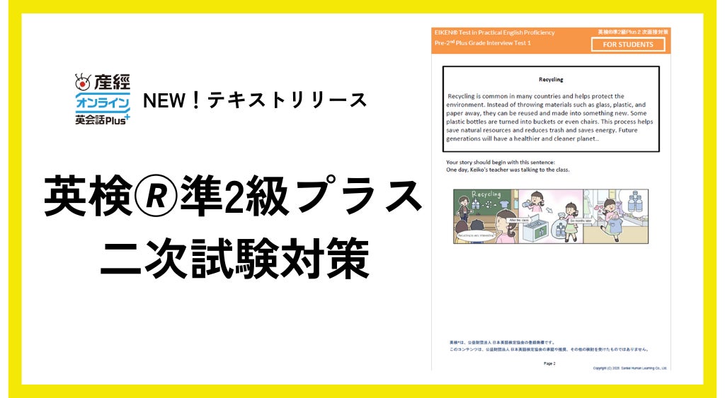 産経ヒューマンラーニング株式会社(本社:東京都新宿区、代表取締役:中谷友紀、以下「当社」)は、「英検🄬二次試験対策」テキストに、新たに「英検🄬準2級プラス」を追加リリースしました。本テキストは、『産経オンライン英会話Plus』のレッスンテキストとしてご利用いただけます。