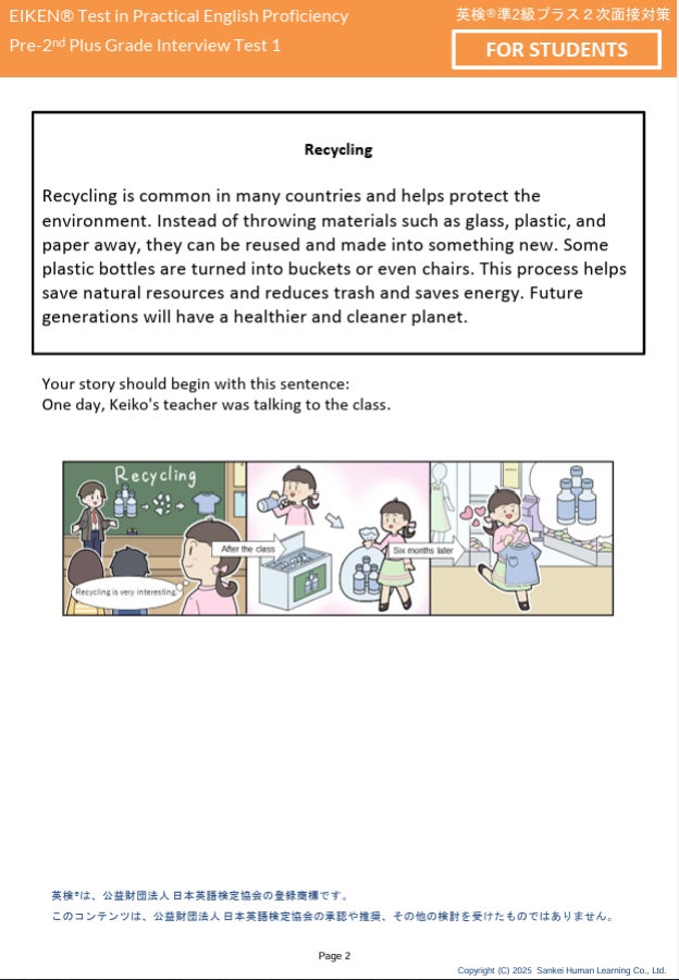 本テキストは、英検🄬準2級と英検🄬2級の間のレベルに位置づけられた新しい級、英検🄬準2級プラスの二次試験対策テキストです。オンライン英会話レッスンを通じて、試験に必要なスピーキング力を効率的に身につけられるよう設計されています。特に、「試験形式に慣れておきたい方」「英語をスラスラ読む自信をつけたい方」「自分の意見を伝える力を伸ばしたい方」に最適な内容です。