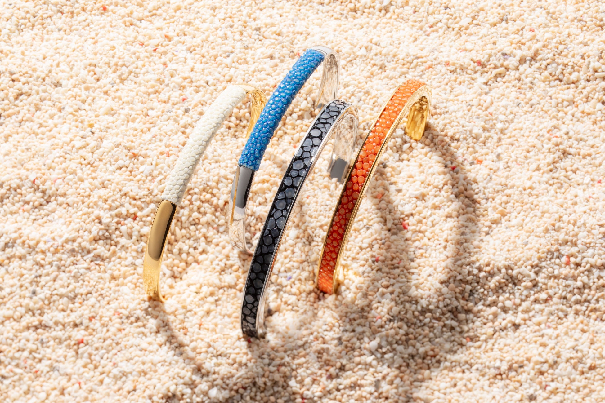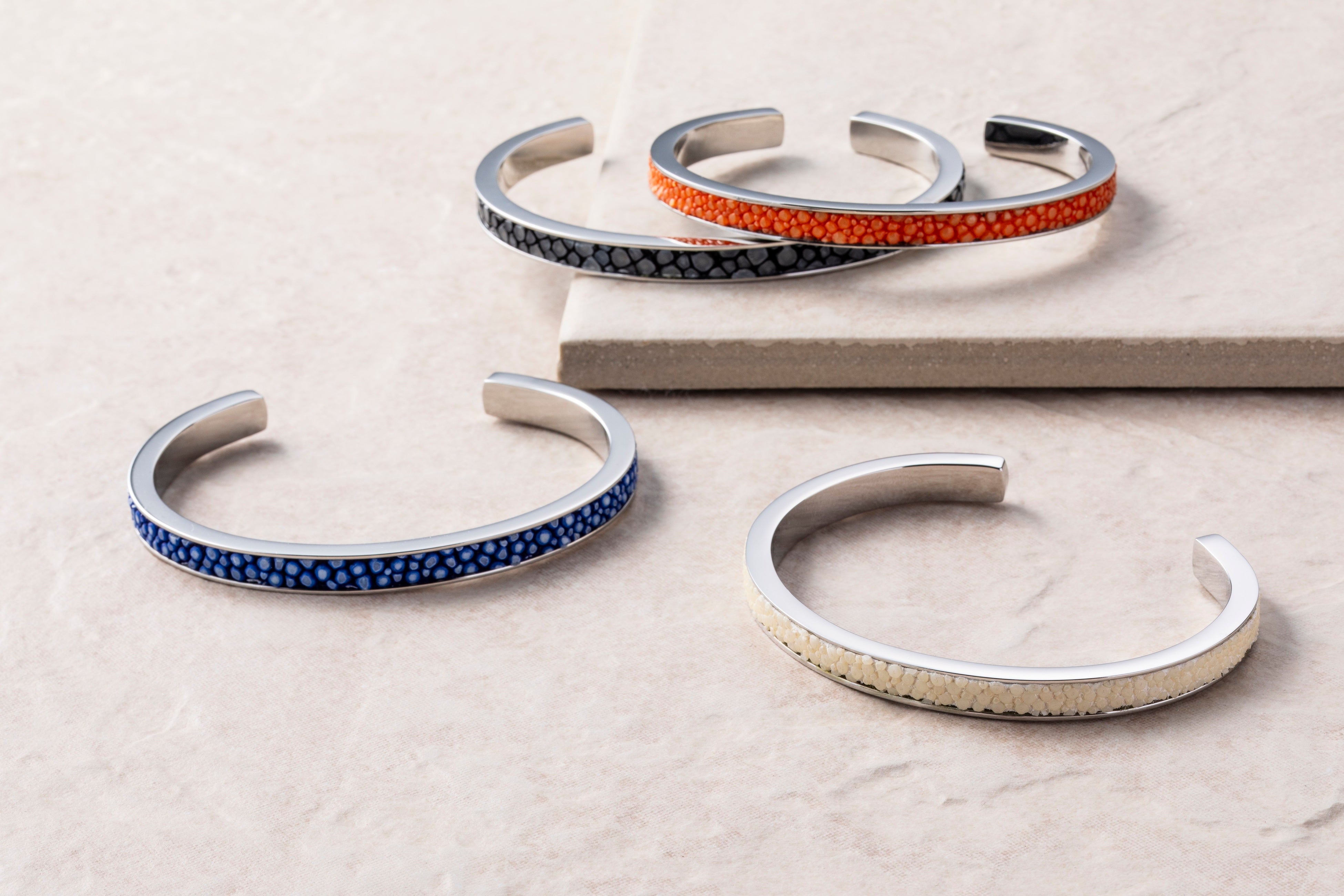 【商品概要】 ■商品:「LONVA」ガルーシャブレスレット セミオーダー ■価格:12,100円(税込) ■素材:ガルーシャ (エイ革) ・サージカルステンレス ・ハーフポリッシュ仕立て(シルバー)18Kのゴールド仕上げ(ゴールド) |