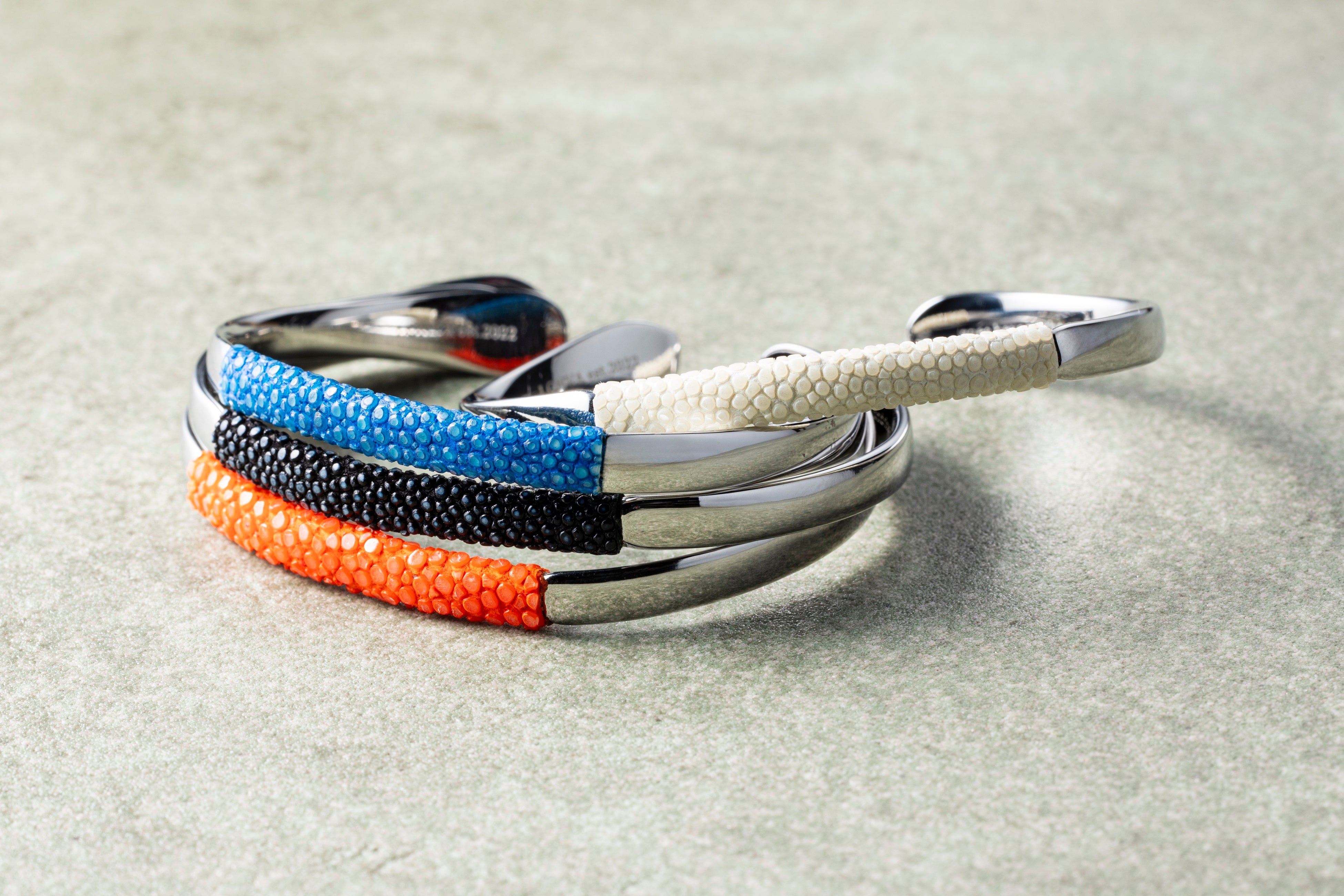 ブレスレットは医療器具にも使われるサージカルステンレス製、金属アレルギーも起こりづらいとされています LONVAで人気のカラー、ブラック、ホワイト、ブルー、オレンジの4色を厳選し、ブレスレットのタイプ(ゴールドまたはシルバー)、モデル(サコルデとアンバレ)を自由に組み合わせてお選びいただけます。普段使いは勿論、2本付けやパートナーとのカップリングもおすすめです。 ワンサイズ展開ですが、1センチ程度開口部を拡げることが可能です。 また、天然皮革の中でも際立つ堅牢性と耐久性、素材は食品加工の副産物 LONVAのガルーシャ革は食料として漁獲されたエイを再利用。環境への配慮を考えた製品づくりを行っています。