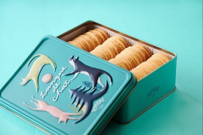 お菓子に添えられたストーリーにもほっと心が和む、可愛らしい猫の缶に入った