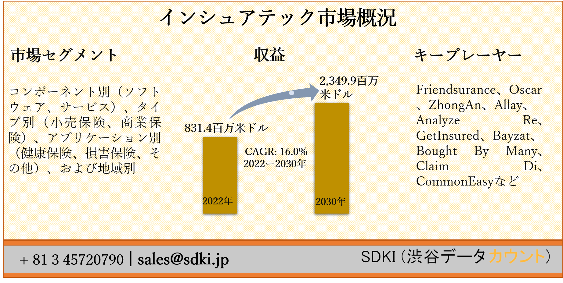 SDKI Inc.は、「(保険技術)インシュアテック市場ー予測2022ー2030年」新レポートを 2022年01月18日に発刊しました。この調査には、インシュアテック市場の成長に必要な統計的および分析的アプローチが含まれています。レポートで提供される主要な産業の洞察は、市場の既存のシナリオに関する読者に市場の概要についてのより良いアイデアを提供します。さらに、レポートには、市場の成長に関連する現在および将来の市場動向に関する詳細な議論が含まれています。