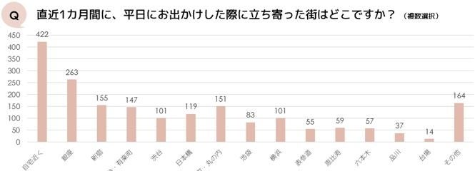 Q、直近一カ月間に、「平日」にお出かけした際に立ち寄った街はどこですか?(複数選択)