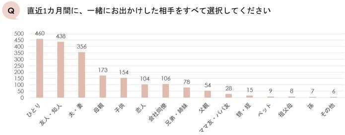 直近1カ月でおでかけした相手を聞いたところ、1位「ひとり」、2位「友人・知人」、3位「夫・妻」という結果となりました。また「母親」も4位にランクインしており、母娘でのおでかけも多いことが分かります。