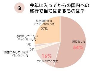 A、旅行をした:54%、これから行く予定:16%、計画のみしていたが行かなかった:2%、予約をしていたがキャンセルした:1%、旅行の計画は立てていなかった:27%