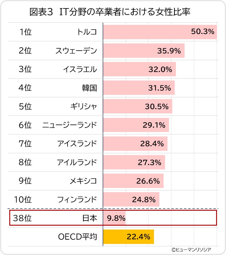 将来的にIT分野で活躍することが期待される、IT分野(Information and Communication Technologies)専攻およびSTEM分野(Science, technology, engineering and mathematics)の卒業者に占める女性比率について、OECD各国を比較すると、IT分野で最も女性比率が高いのはトルコで、女性比率は半数を超える50.3%でした。続いて2位はスウェーデン(35.9%)、3位はイスラエル(32.0%)と続き、韓国が31.5%で4位に入りました。