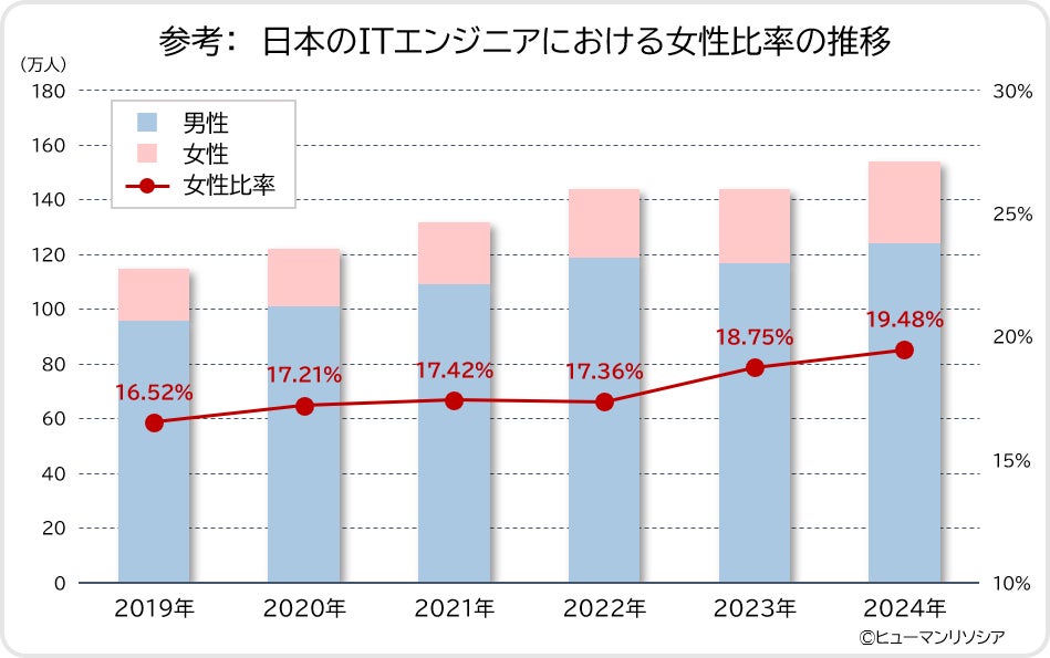 ※1 2024/3/8発表プレスリリース [IT 分野のジェンダーギャップに関するグローバル調査] ITエンジニアの女性活躍が進む北欧およびバルト3国、日本の女性比率は17%に留まりOECD38カ国中22位、STEM分野の卒業者における女性比率では、最下位の結果に