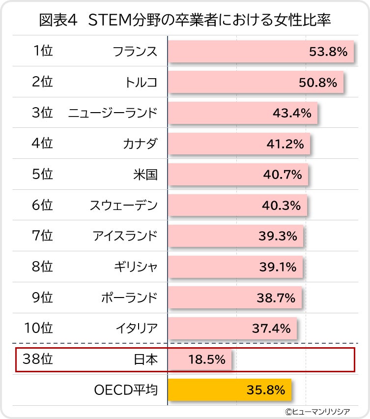 またSTEM分野においては、最も女性比率が高いのはフランスで53.8%、続いて50.8%のトルコ、そして43.4%のニュージーランドとなりました。
