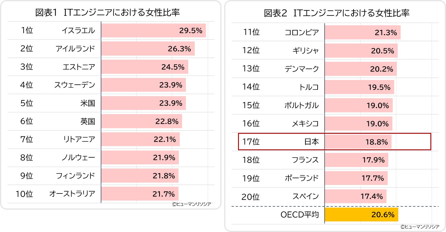 ITエンジニアの女性比率、日本は18.8%でOECD加盟国中17位、ITおよびSTEM分野卒業者の女性比率は、OECD最下位と将来の女性活躍が危惧される結果に