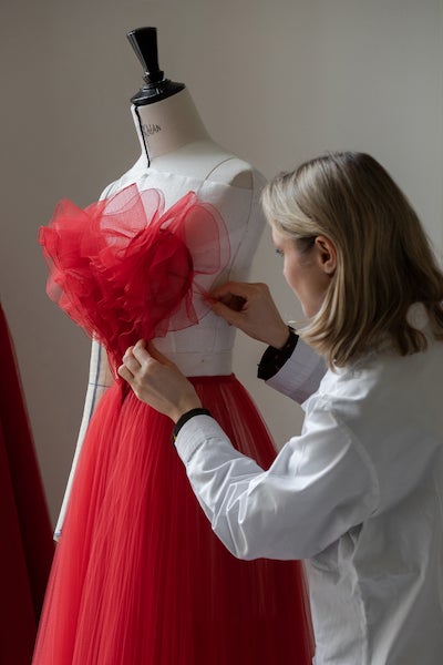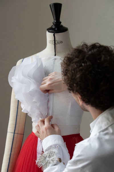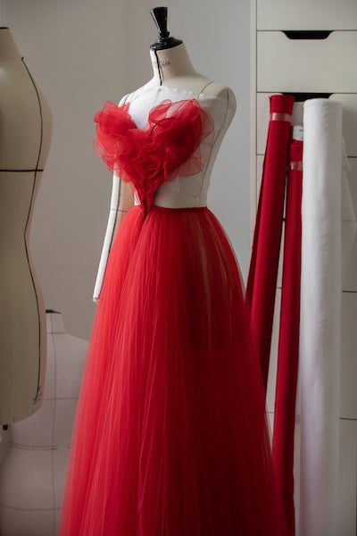 ジェナ・オルテガはオートクチュール コレクションより赤いチュールドレスを纏い、ディオール ファイン ジュエリーのホワイトゴールド、ピンクゴールドにダイヤモンドがあしらわれた「ボワ ドゥ ローズ」のネックレス、ブレスレット、リングをドレスに合わせ登場しました。この機会のために特別に仕立てられたオートクチュールプリーツガウンドレスには、「ディオール レッド」のチュールがふんだんに使用されました。デコルテ部分はハート模様がデザインされています。このドレスの制作にはディオール アトリエで600時間が費やされています。