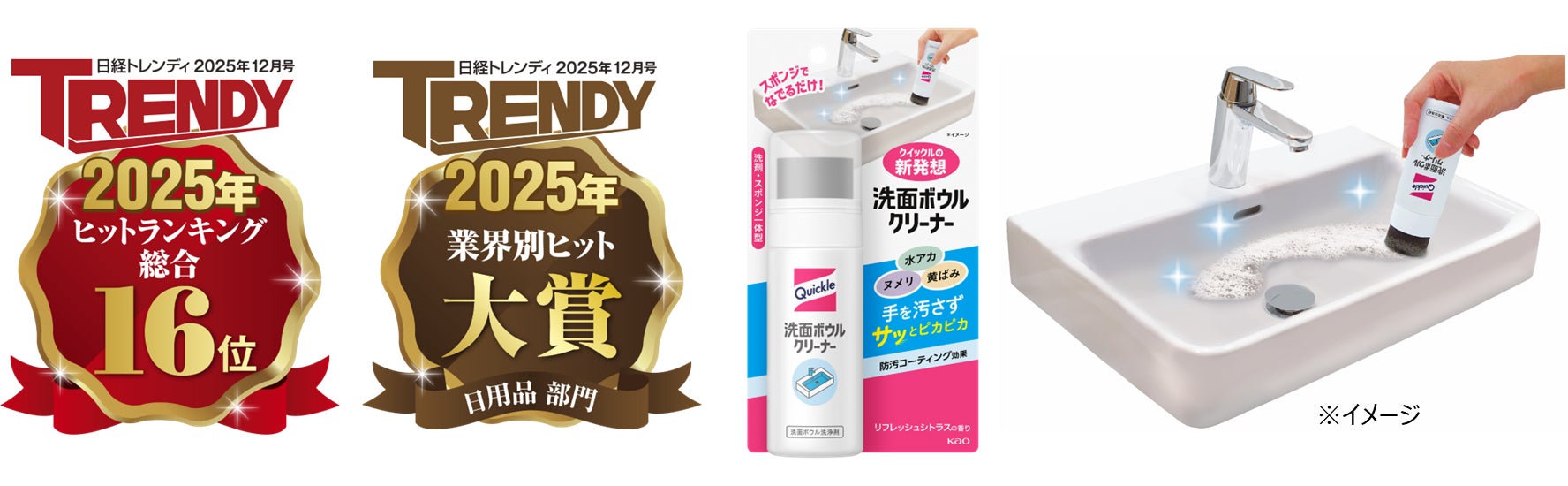 花王の『クイックル 洗面ボウルクリーナー』は、『日経トレンディ』2025年12月号(2025年11月4日発売)の「2025年ヒット商品ベスト30」にて16位に選出されました。同時に「業界別ヒット2025」においても、「日用品部門 大賞」を受賞しました。