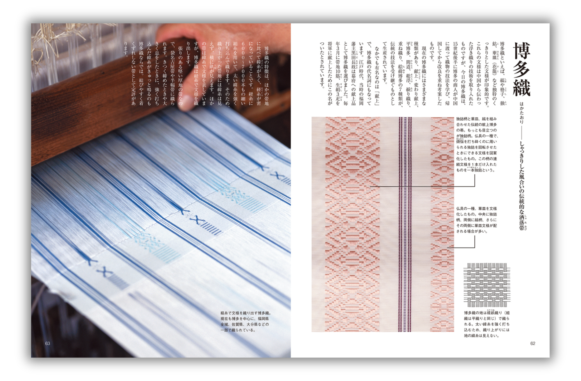 染め織りの現場を取材した臨場感溢れる写真や織りの組織図なども収載。帯文化の奥行きを知りたい上級者の方の要望にもお応えできる、保存版の一冊です。