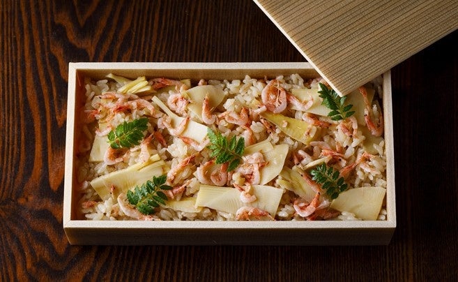 「賛否両論」での食事の楽しみのひとつが、季節ごとに変わる炊き込みご飯。今回のフェアでは、ふっくら炊き上げる熱々の炊き込みご飯を店内でお召し上がりいただけるほか、おこもり派やご家族へのお土産用に「生桜海老と新竹の子炊き込みご飯」(写真・1折¥2,500)と「牛フィレ山椒焼きと新竹の子炊き込みご飯」(1折¥4,300)をご用意。ご自宅でも「賛否両論」の味が気軽にお楽しみいただけます(事前予約制)。