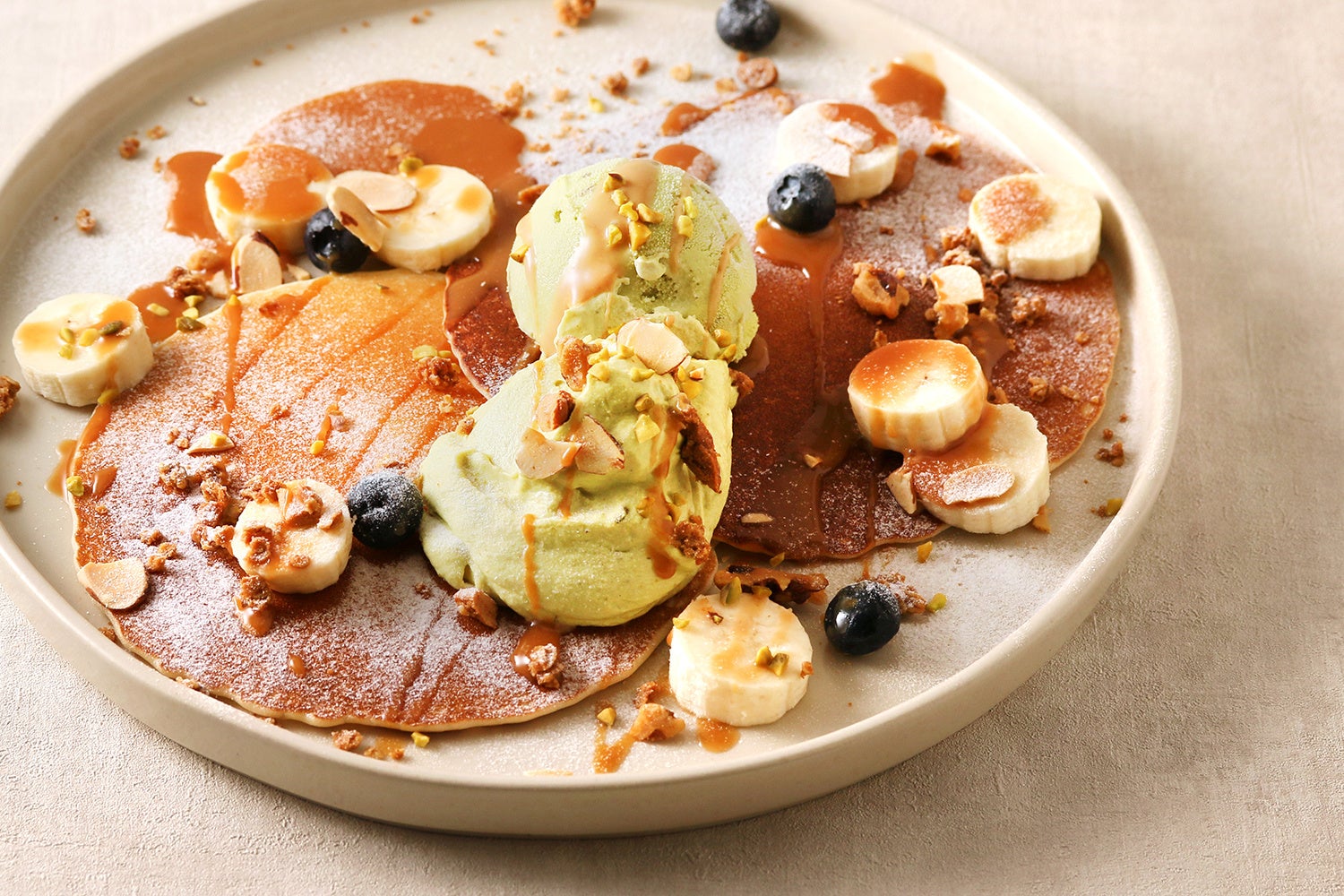塩味が効いたキャラメルソースとバナナ、ピスタチオアイスが相性抜群のパンケーキ。