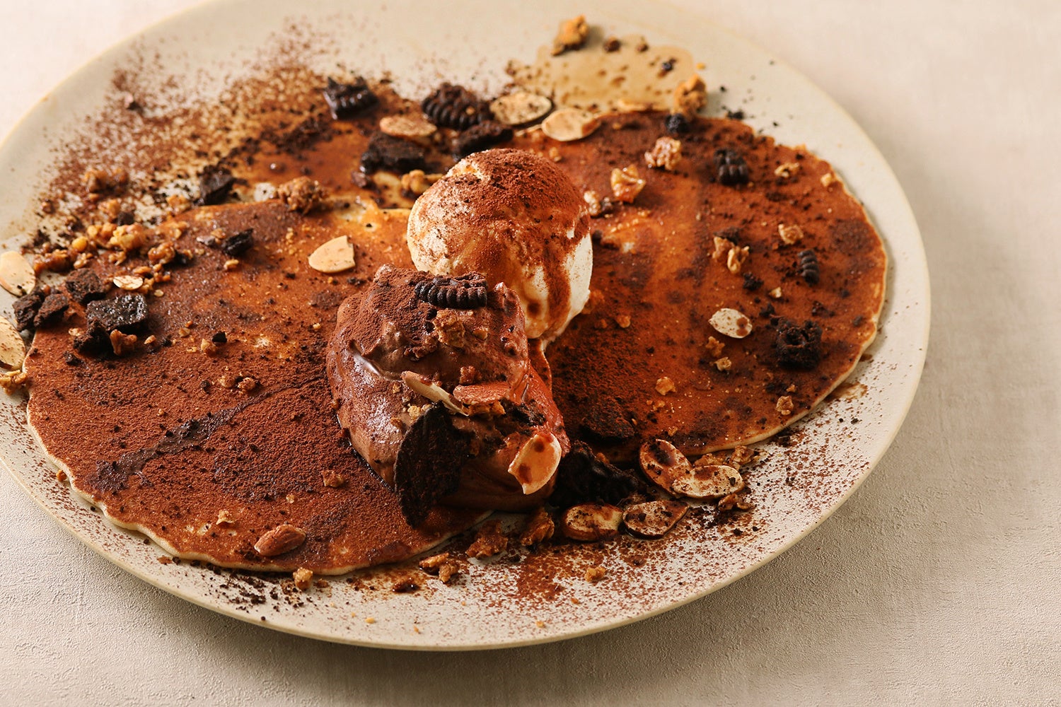 高級なクーベルチュールチョコとTAOCA COFFEEのエスプレッソで作るカカオソースの香り豊かな、大人のパンケーキです。