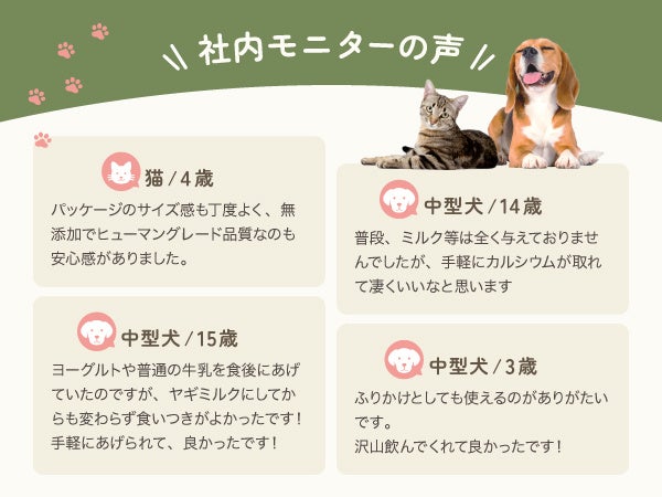 冷水でも溶けやすい粉末タイプで、与え方は自由自在。フードへのトッピング、水分補給、手作りおやつの材料など、日常のあらゆるシーンで“ごほうびミルク”として活用できます。