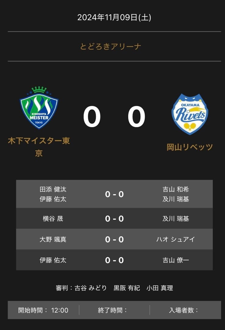 ノジマTリーグ 2024-2025シーズン 公式戦 11月9日開催 木下マイスター東京 vs 岡山リベッツ 対戦オーダー発表