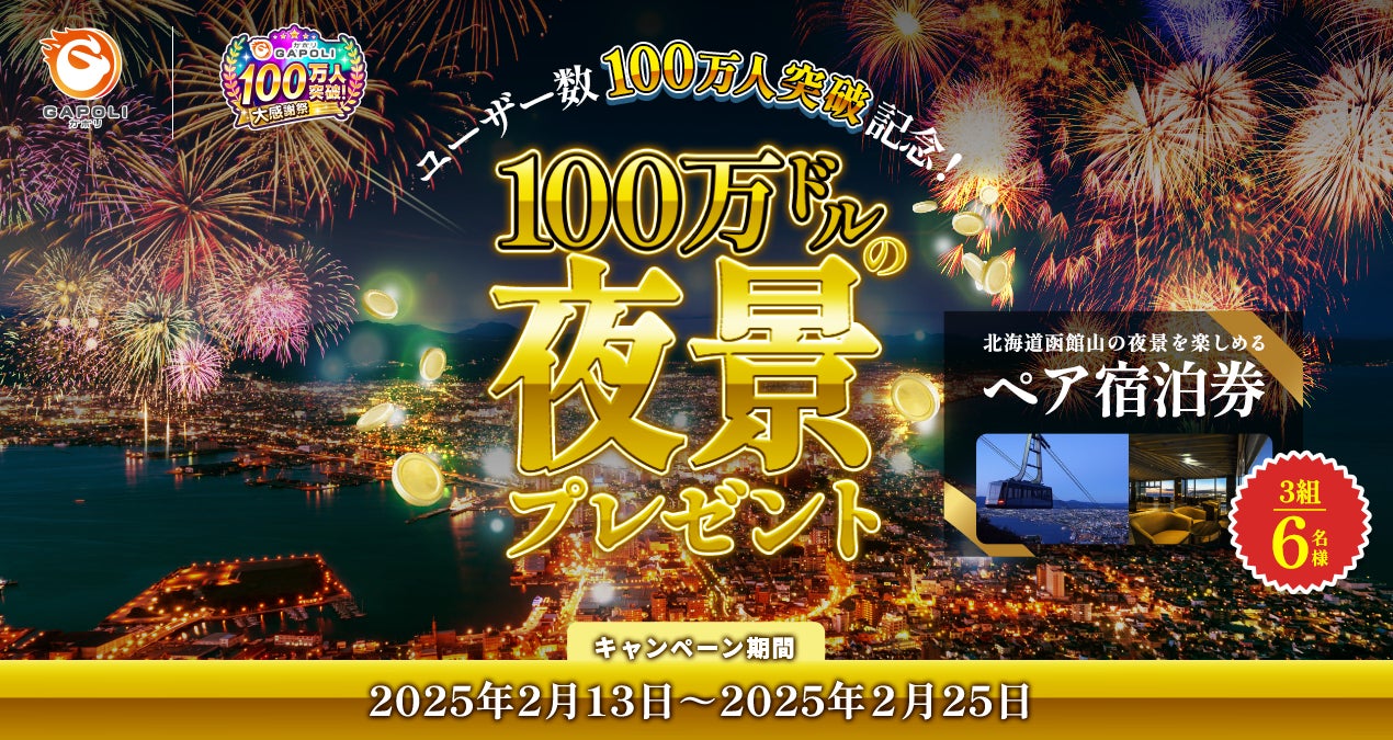 『GAPOLI』ユーザー数100万人突破記念!「100万ドルの夜景」プレゼント!函館の豪華宿泊券が3組6名様に当たる!さらにゲーム内でもお得なキャンペーン実施中!